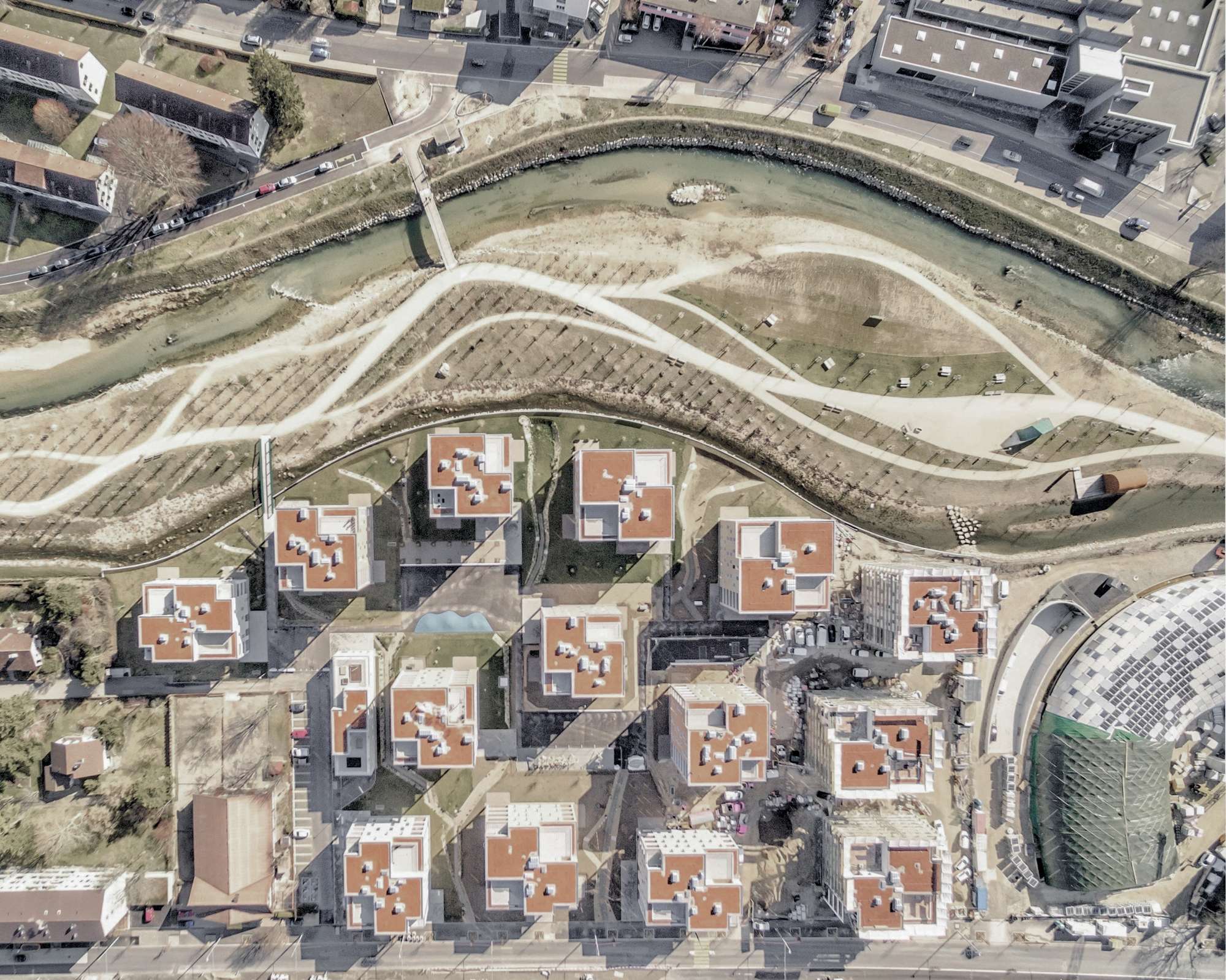 Die westliche Arealhälfte gehört dem Uhrenkonzern Swatch, der seine repräsentative Firmenzentrale, das schlangenförmige Holz-gebäude des japanischen Architekten Shigeru Ban, gebaut hat.