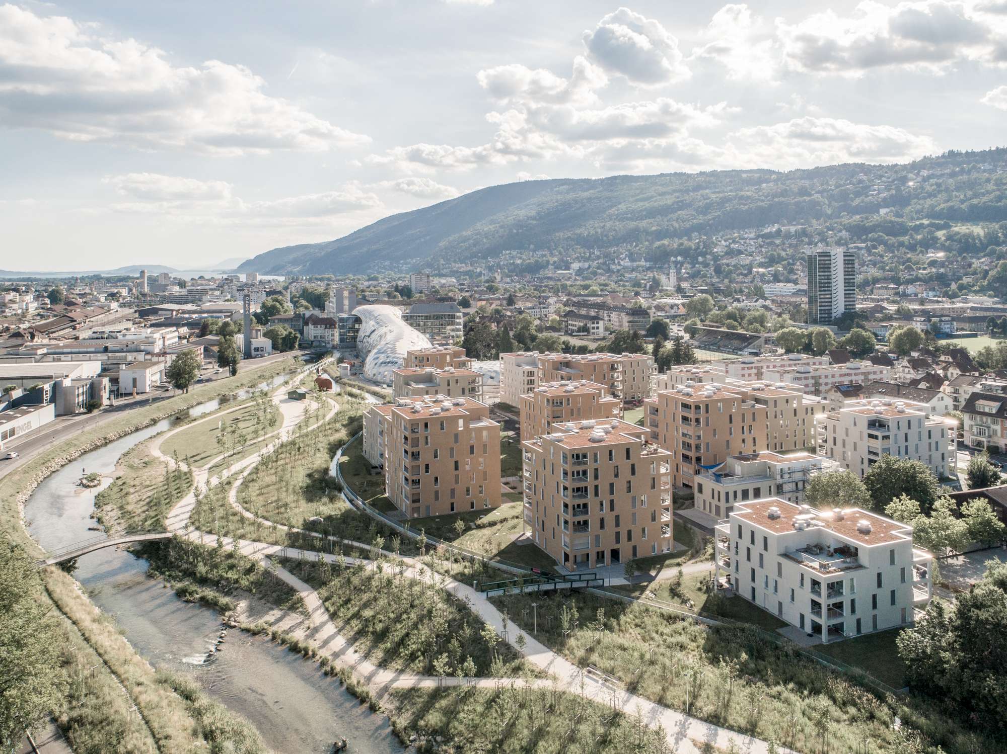 Die Wohnungen sind lichtdurchflutet und bieten spannende Sicht- und Querbezüge zur Jurakette und zur Schüss. Die Überbauung setzt auf erschwingliche Mieten und eine hohe Dichte mit bis zu siebengeschossigen Häusern.