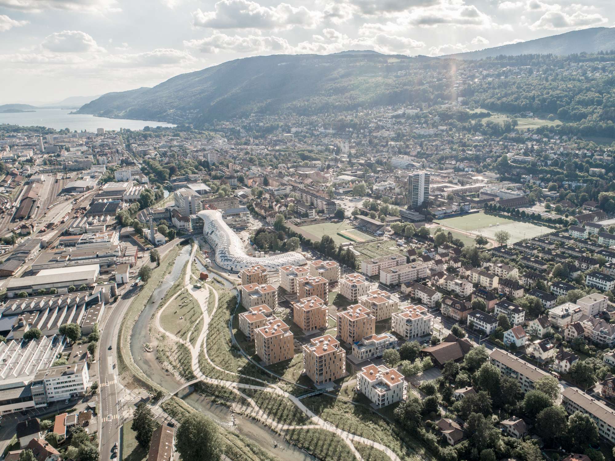 — Auf einer knapp 7 Hektar grossen Brache, direkt neben dem Güterbahnhof in Biel, ist es gelungen, unterschiedlichste, private und öffentliche Anliegen flächenschonend, grosszügig und hochwertig unterzubringen.