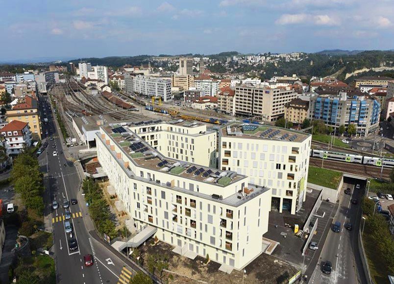 Die sich im Sockelbereich befindlichen Gewerberäume und die Kita, die ein wichtiges Element für die Unterbringung junger Familien ist, sorgen dafür, dass das Areal mit Leben erfüllt wird. Der Entwurf ermöglicht und fördert gezielt den Kontakt zwischen den ArealbewohnerInnen. Der Aussenraum wird durch den vom Hauptgebäude umfassten Hof geprägt und dient, zusammen mit dem gemeinsamen Garten, als Begegnungsstätte für Jung und Alt. Im Innern laden Orte wie eine emeinschaftliche, lichtdurchflutete Waschküche, eine Cafeteria und ein grossräumiges, freundliches Treppenhaus im Monolith zum Verweilen und Kontakte knüpfen ein. Diese sorgfältig geplanten Begegnungszonen sind wichtiger Bestandteil des Konzepts und sorgen dafür, dass auf dem Areal eine einladende und freundliche Atmosphäre entsteht. Mit seiner attraktiven, zentralen Lage in Bahnhofsnähe bietet der Gewerbe- und Wohnkomplex eine perfekte Anbindung zu den öffentlichen Verkehrsmitteln und der Altstadt von Freiburg. Auch die kurze Entfernung zu den Startups im naheliegenden Innovationsquartier „Bluefactory“ macht diesen Standort besonders attraktiv. Die Message des zukunftsorientierten Wohnkonzepts wird durch die nachhaltige Bauweise und Energienutzung des Areals unterstützt. Im Innenausbau wurde auf solide und langlebige Materialien gesetzt. Auf dem Dach sind Solarpanels installiert.