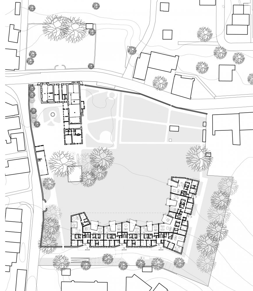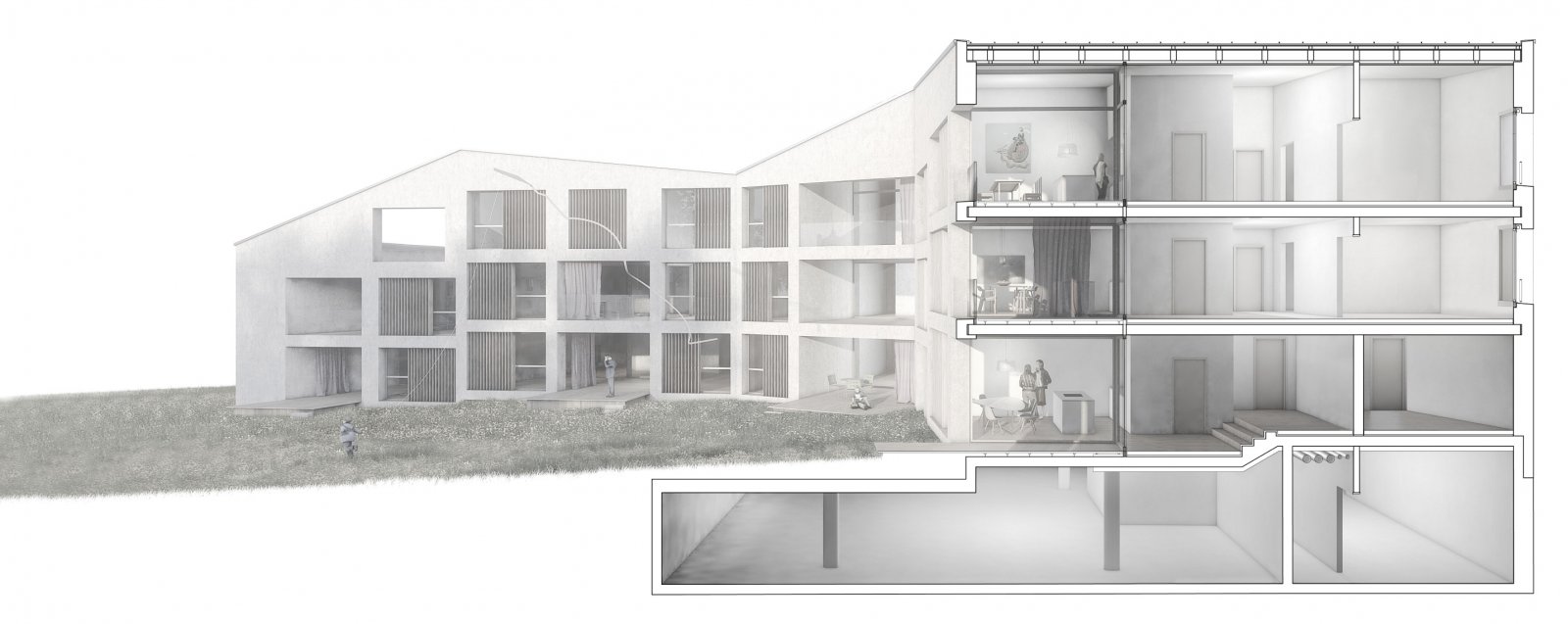 Die städtebauliche Setzung ermöglicht eine starke und vielschichtige Beziehung zwischen dem neuen Raumkörper und dessen unmittelbarem Aussenraum, wobei das übergreifende Dach zum wichtigen verbindenden und schützenden Element wird. Ziel ist es, dadurch eine Einheit sowohl im Äusseren (Gebäudekörper) als auch in der inneren Raumstruktur zu schaffen. Das Faltdach tritt in Dialog mit dem historischen Bestand und übernimmt Elemente der Formensprache einer archetypischen Architektur. Die mehrfach geknickte West- und Nordwestfassade gibt mit ihrer bewegten Dachsilhouette dem Aussenraum des Parks einen Halt. Sie ist grossflächig verglast und öffnet den Innenraum zum Park. Der grosszügige Gartenraum bleibt mit seinem Baumbestand erhalten und wird verstärkt erlebbar. Die Ausfachung mit vertikalen Sichtblenden aus Holz rhythmisiert spielerisch zwischen den massiven Tragpfeilern. Tief eingeschnittene Loggien bringen Licht und Grün in den Raumkörper. Die Weite des Ausblicks wird das bestimmende Thema und auf eindrucksvolle Weise inszeniert. Malerische Baumgruppen und grosszügige Wiesenflächen verleihen das Gefühl von Stabilität und Endlosigkeit im Garten.