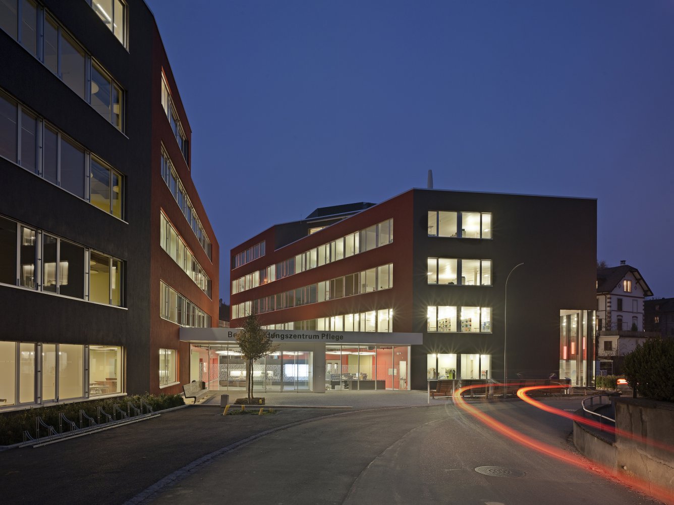 Für das Projekt sollte ein früheres Werkhofareal neu überbaut werden, welches bereits von den Siedlungsarmen der Stadt umschlossen war. Die verwinkelte Parzelle zwischen Autobahn, Eisenbahn, Strassenbahn und der viel befahrenen Freiburgstrasse ins Stadtzentrum war eine Herausforderung für die Einordnung und Gestaltung des Gebäudes. Die kontextuelle useinandersetzung mit dem Ort, der Entwicklung des architektonischen Konzepts in Bezug auf Massstäblichkeit und Angemessenheit sowie das vielschichtige Anforderungs- und Raumprogramm einer Bildungsstätte für Pflegeberufe waren die Potenziale, die es zu erkennen und umzusetzen galt. Entstanden ist ein eleganter, räumlich schöner und angenehm unprätentiöser Bau, der sich mit der Form eines „S“ gut in die Parzelle und Umgebung einfügt.