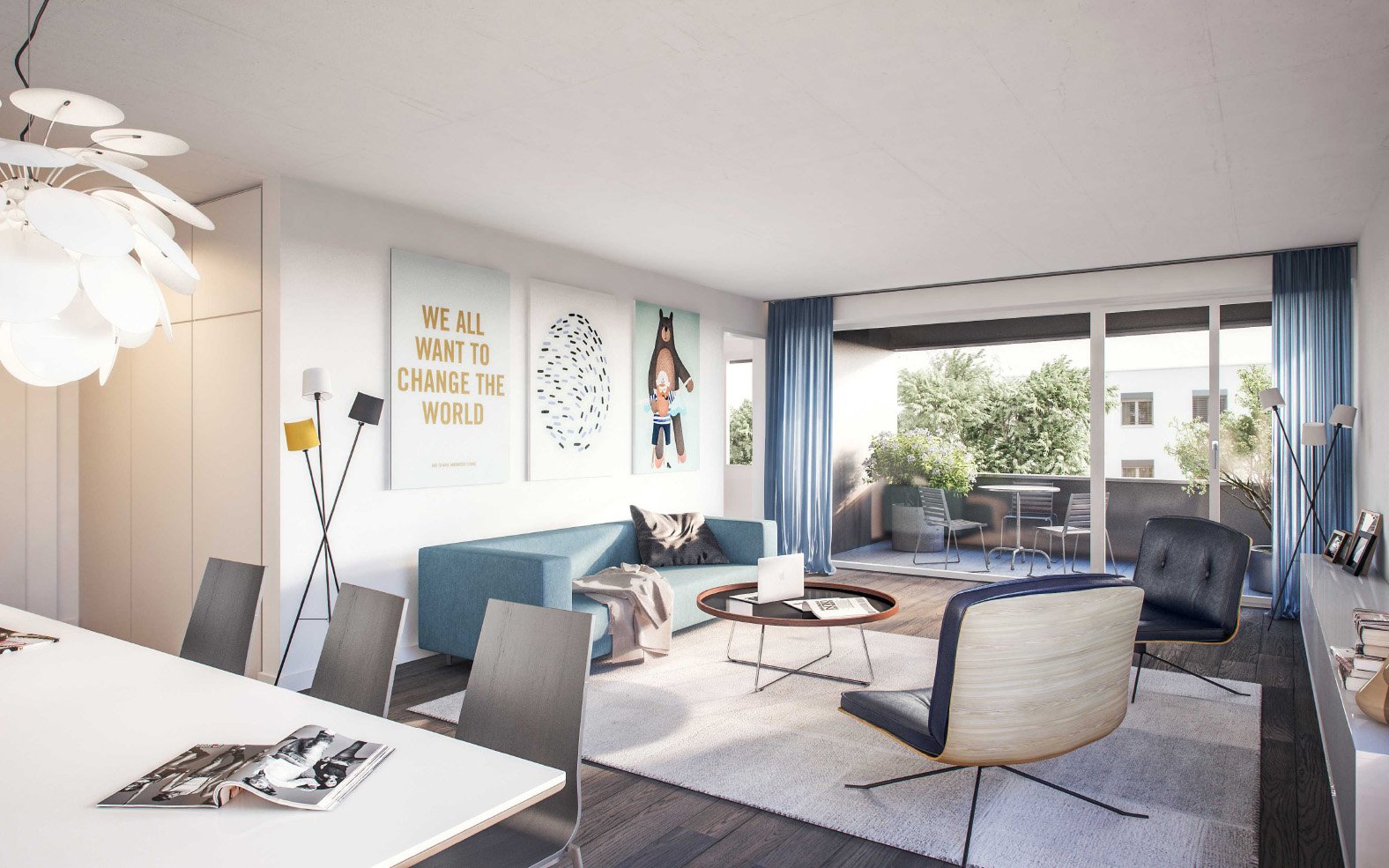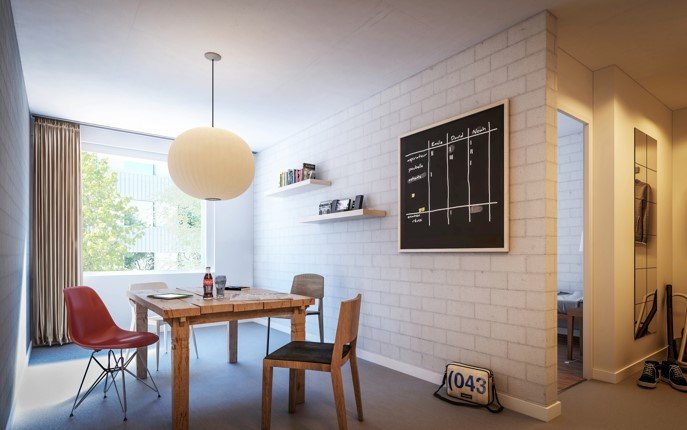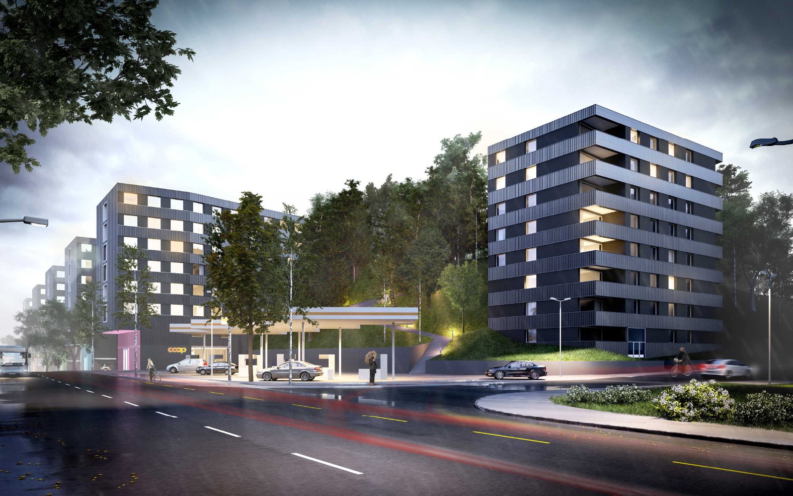 Ein zusätzliches Gebäude, hinsichtlich seines Grund-risses deutlich polygonaler ausformuliert, steht weiter westlich, hinter der Coop-Tankstelle, die mit ihrem markanten Zickzackdach erhalten bleibt. Hier werden 30 Wohnungen für junge Erwachsene realisiert.