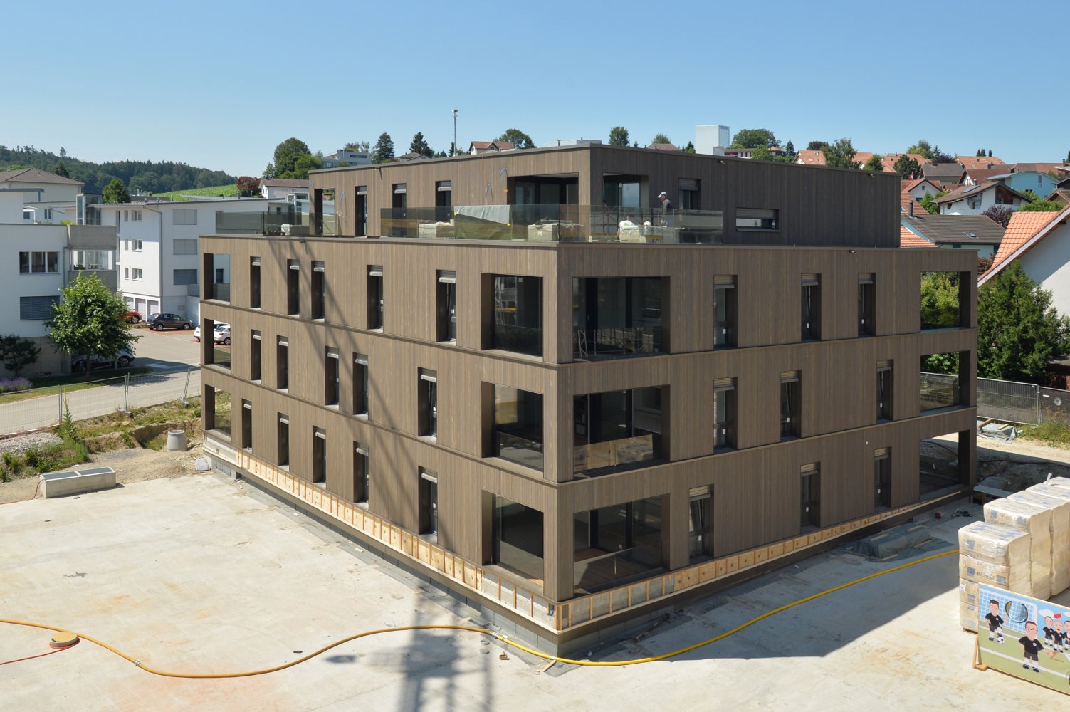 Der Wohn- und Essbereich verfügt über einen direkten Zugang auf die Loggien/Terrassen. Jede Wohnung verfügt über einen eigenen Waschturm. Der direkte Zugang in die Einstellhalle führt trockenen Fusses zum Parkplatz. Für Elektrofahrzeuge wurden Anschlüsse zur Installation vorgesehen. Die hinterlüftete Holzfassade schafft zu jeder Jahreszeit ein optimales Raumklima.