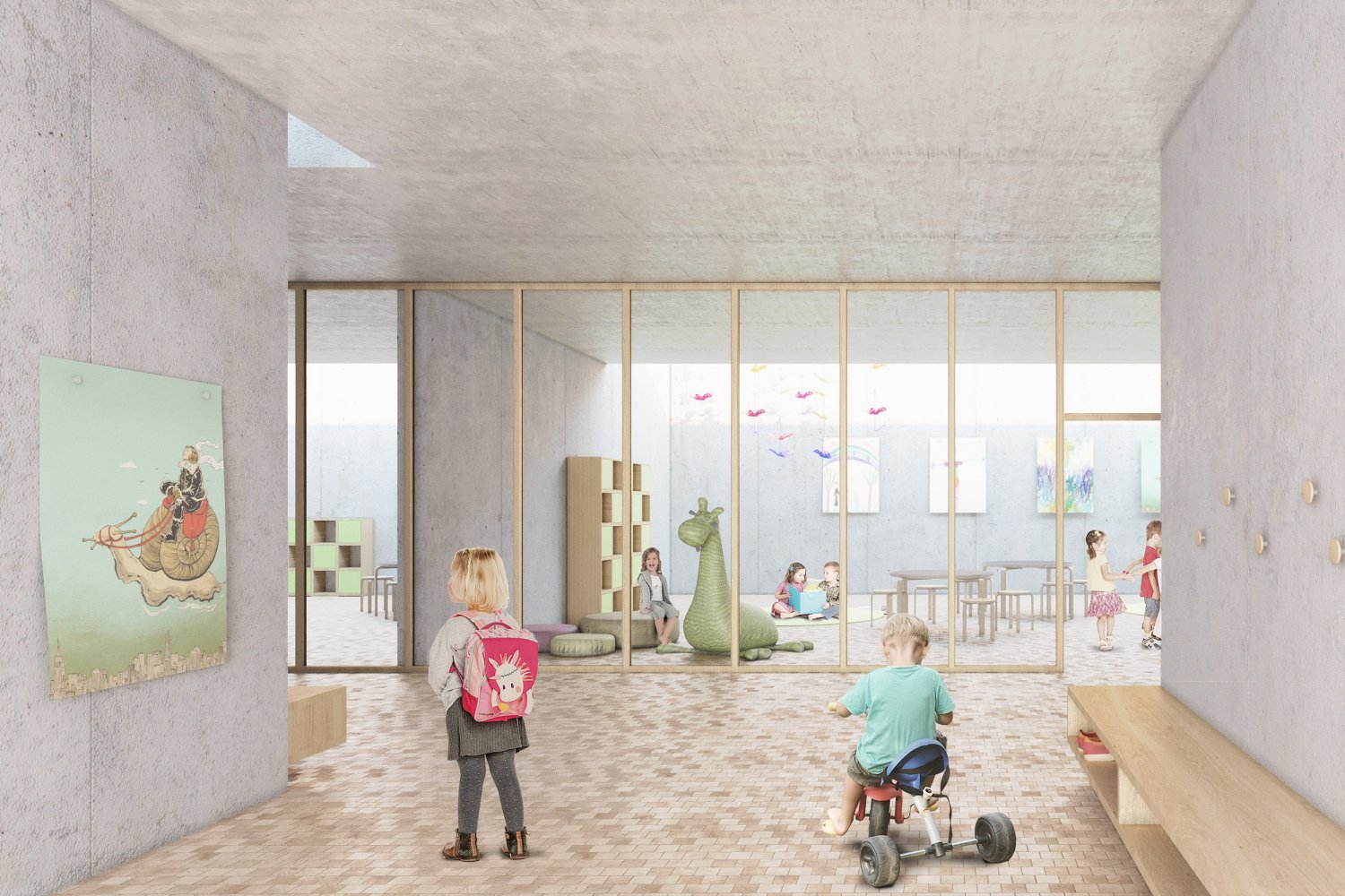 Durch die zurückhaltende Architektursprache tritt der Pavillon unprätentiös, hell und lichtdurchflutet in Erscheinung. Damit räumt er Schülern, Kleinkindern und Lehrpersonen die Freiheit ein, sich das Gebäude anzueignen und mit Leben zu füllen.