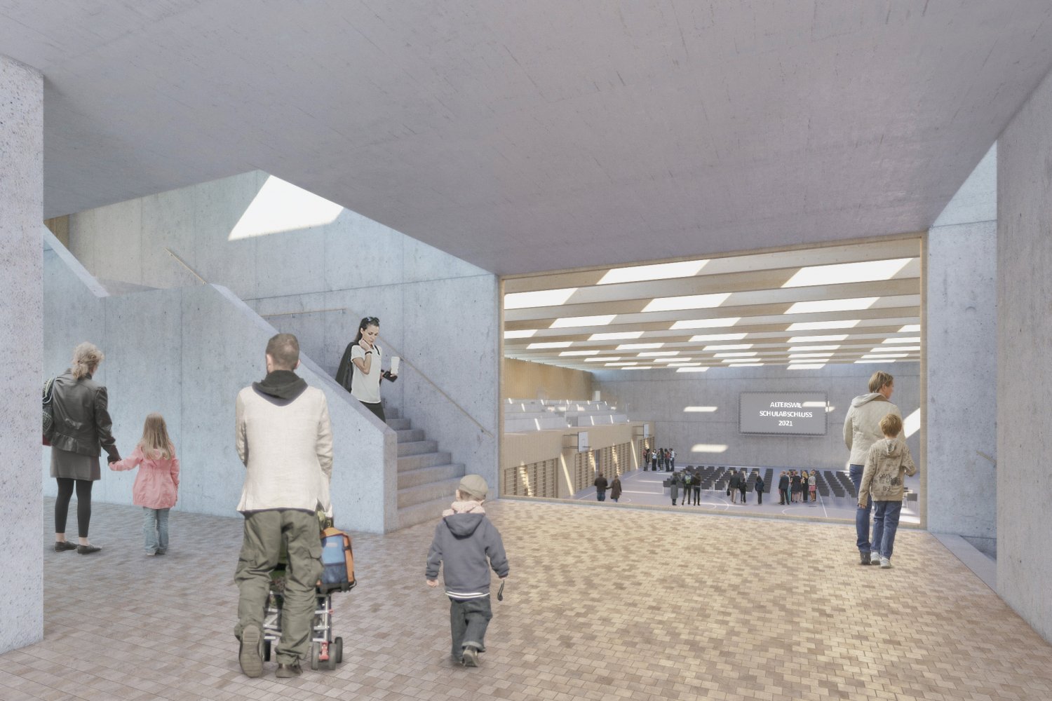 Zwei frei platzierte Neubauten mit fliessenden Zwischenräumen bilden mit dem bestehenden Schulhaus eine grosszügige Gesamtanlage, welche die landschaftlichen Qualitäten des Quartiers aufnimmt und die grossen Bauvolumen in den kleinteiligen Kontext integriert. Die Bauten sind durch ihre differenzierte Höhenstaffelung volumetrisch zueinander in Beziehung gesetzt und schaffen mit ihren Sockelbauten einen angenehmen Übergang zur Fussgängerebene. Der eigenständige architektonische Ausdruck bindet das bestehende Schulhaus und die Gemeindeverwaltung mit ein und soll eine starke Identität als zusammengehöriges öffentliches Ensemble aufbauen.