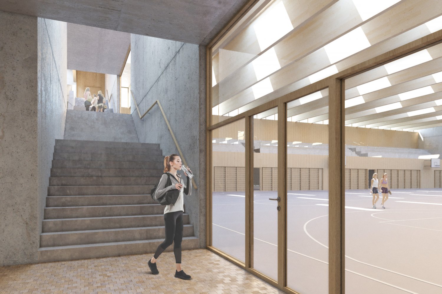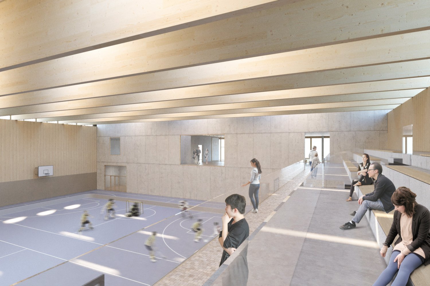 Die aufgeweitete Flurzone im Erdgeschoss gewährleistet einen hohen Grad der Flexibilität und bietet mit dem Vereinslokal sowie einer Klein-Küche mit Mittagstisch zum gemeinsamen Essensplausch und Austausch eine nutzungsvariable Aufenthaltsqualität. Auf der westlichen Längsseite erstreckt sich die Zuschauergalerie und dient alle drei Sportfelder an. Die Tribüne Lässt das Publikum das Geschehen aus sämtlichen Winkeln verfolgen und garantiert Platz für Spass, Spannung und Sensationen.
