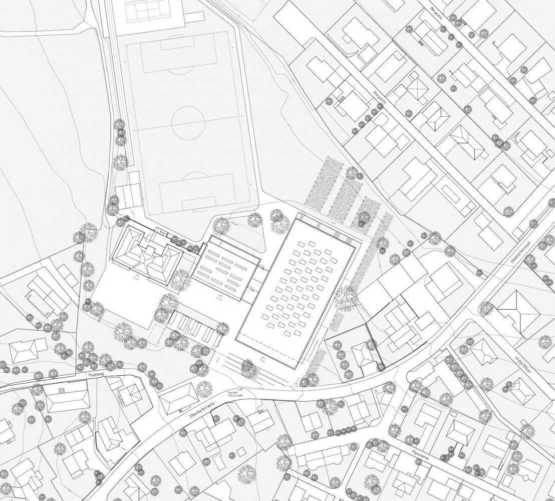 Das Projekt schlägt östlich des bestehenden Schulgebäudes zwei Gebäudevolumen vor: die Mehrzweckhalle im periphersten Bereich und dazwischen ein Schulpavillon mit Klassenzimmern und Spielgruppe. Damit spannen sie, zusammen mit der bestehenden Schule, eine grosszügige und einladende zentrale Freiraumsituation auf, an welcher sämtliche Eingänge angeordnet sind. Mit diesem städtebaulichen Konzept entstehen differenzierte Aufenthaltsbereiche und ein klares, alles verbindendes Wegsystem, wodurch ein ablesbarer südlicher Abschluss des Campus formuliert wird. Durch die präzise Anordnung der zwei neuen Bauten und eine differenzierte Ausformulierung der Zugänge wird der Adressbildung der einzelnen Nutzungen Rechnung getragen und eine Abfolge klar zugeordneter Aussenräume geschaffen. Insgesamt soll damit im heterogenen Quartier ein neues Ganzes mit identitätsstiftendem Charakter entstehen, welches sich trotz der Dimensionen der einzelnen Gebäude gut in den Kontext einzugliedern vermag.